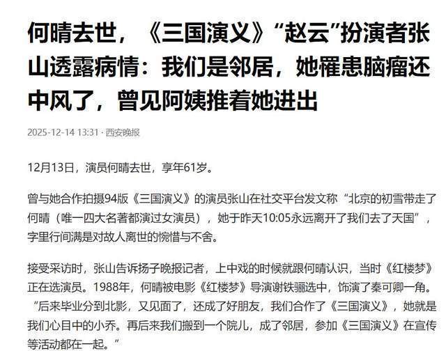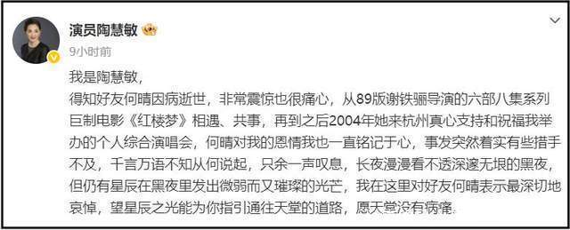 在何晴离世后,六小龄童、陶慧敏、张纪中等人纷纷发文悼念。