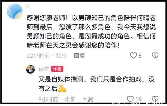 彼时有网友留言感谢廖京生,感谢他以男颜知己的身份陪伴何晴到最后,还说廖京生演了那么多角色,红颜知己是他最成功的角色。