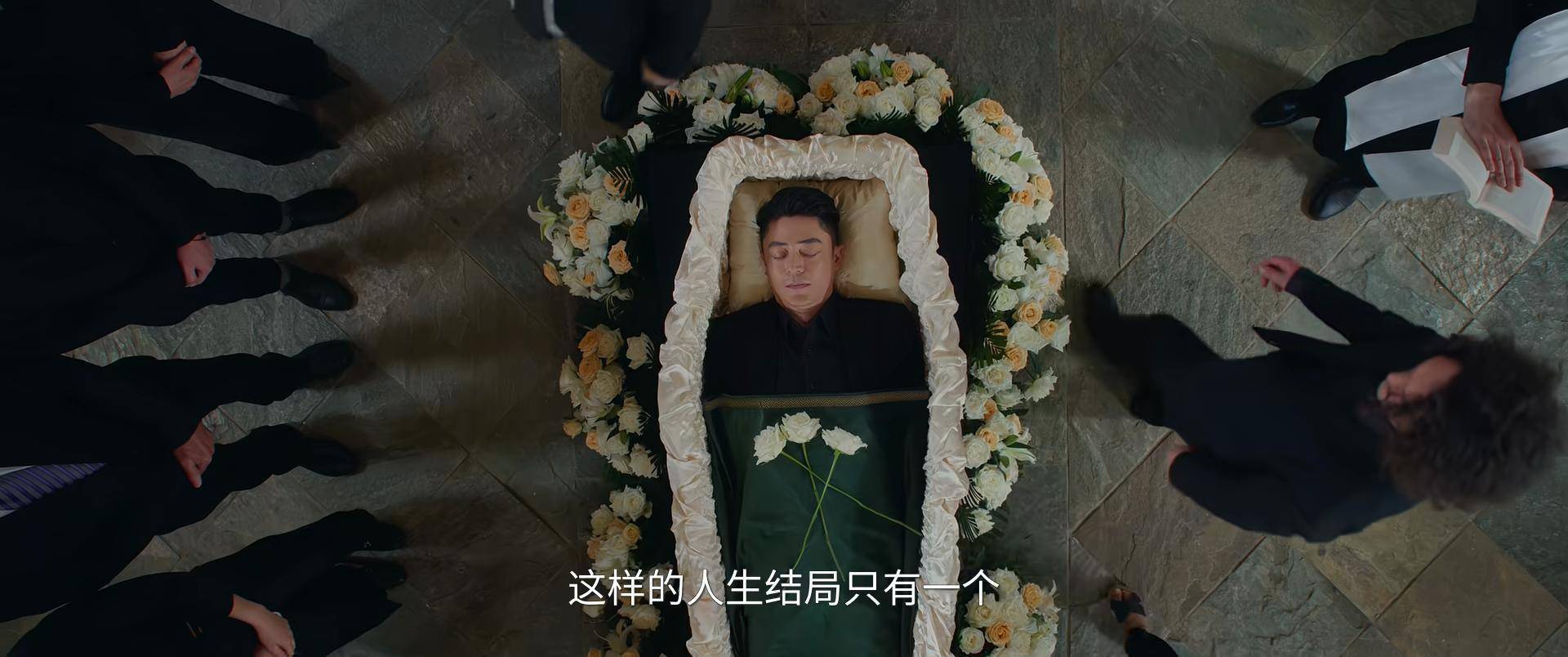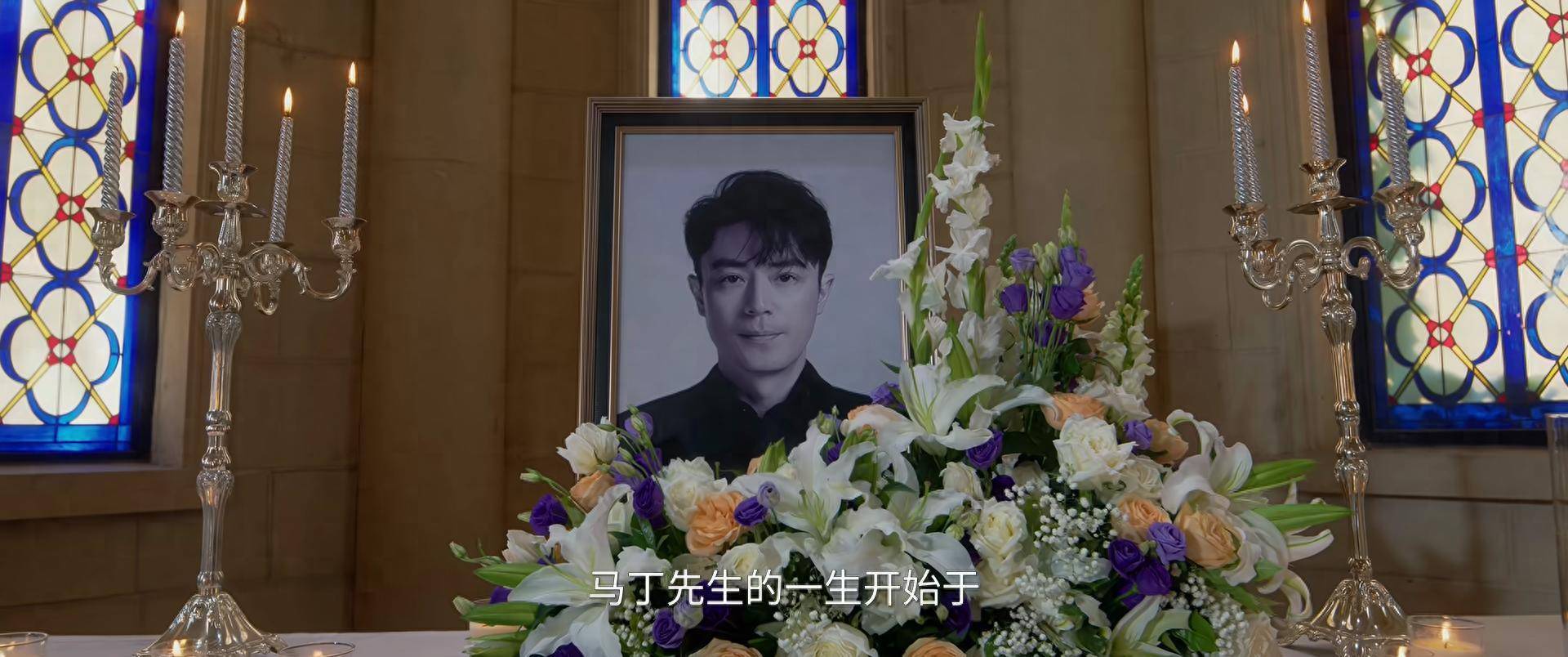 众人神情庄重在棺木前献花,马丁(霍建华饰)面色安详,静静躺在棺木中。
