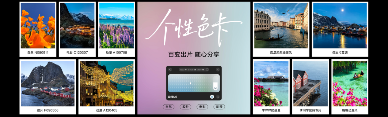 不管是户外拍摄、美食、亲友合拍,还是记录日常,自然、胶片、电影、动漫四种风格,前后置拍摄都能直接调用,随时取用出片。针对不同街拍场景,nova 15还支持DIY专属调色盘。
