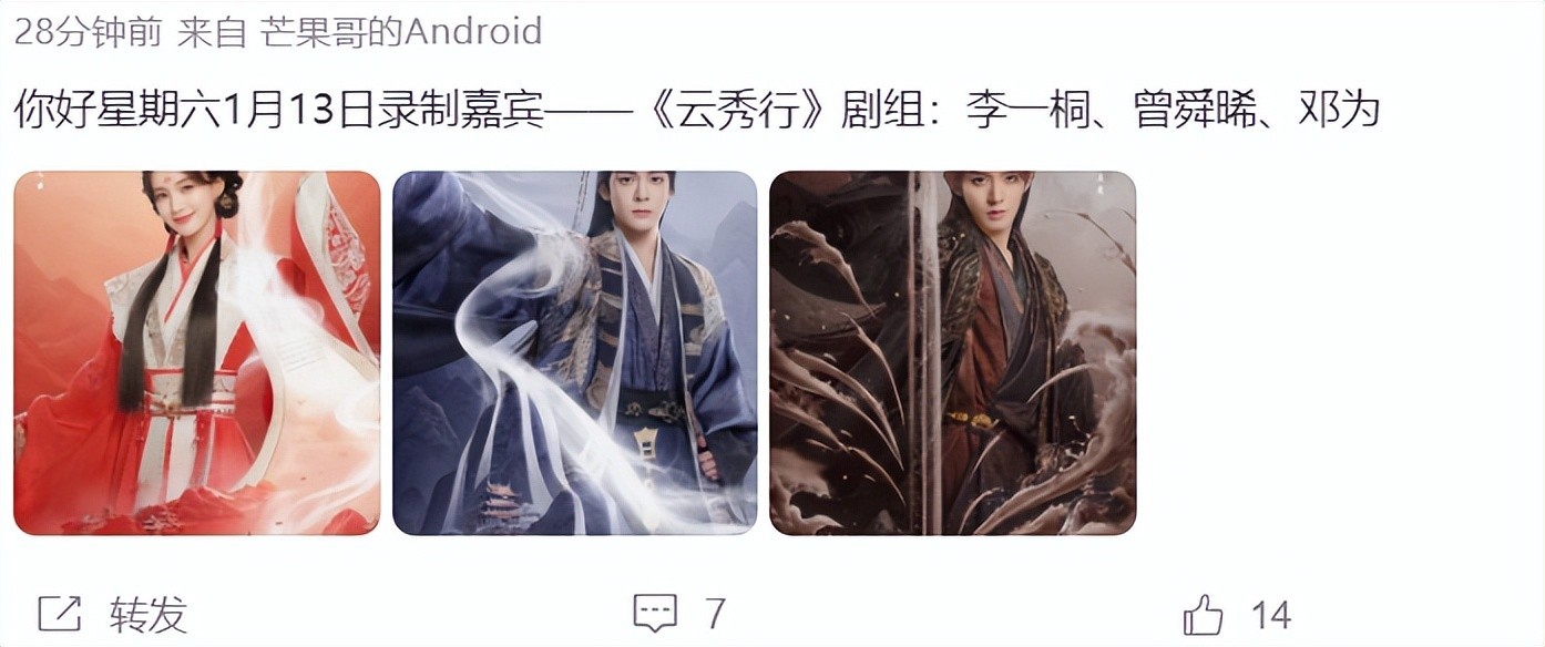 从网上传出的消息上看,《云秀行》中的李一桐、曾舜晞、邓为将录制《你好星期六》,而参与综艺节目录制,意味着这部剧即将与我们见面,官方进入宣传期。
