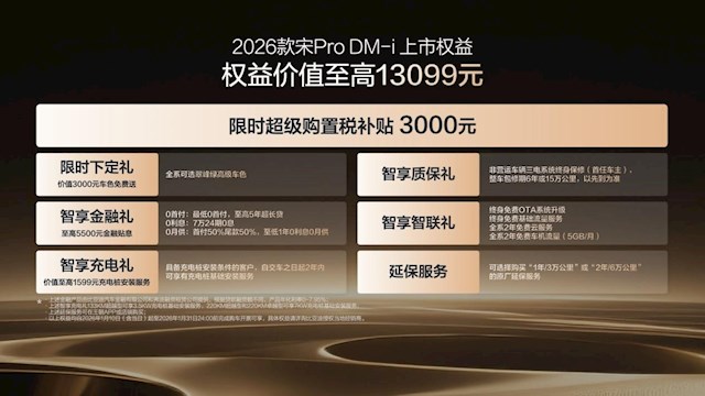 快科技1月11日消息,日前,比亚迪2026款宋ProDM-i220km长续航版本正式上市,共有两款车型,官方指导价分别为12.28万、13.08万元,叠加3000元的限时超级购置税补贴后,限时权益售价为11.98万、12.78万元。
